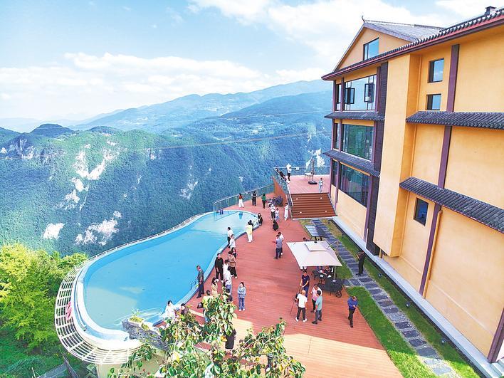 10月12日,在巴东县茶店子镇悬崖民宿综合体,游客在热门网络平台上观赏峡谷风光并打卡。